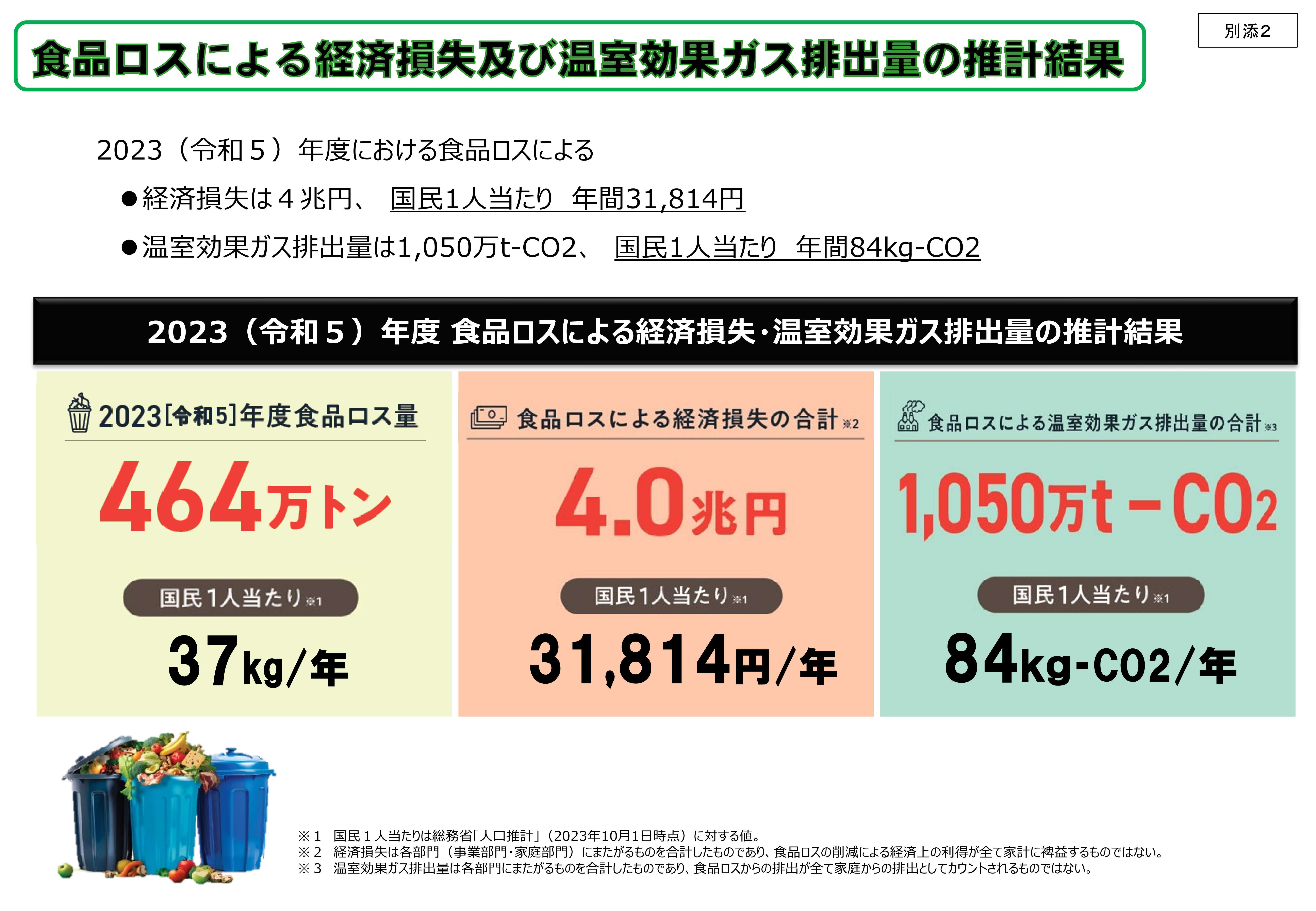 国が今年7月に公表した資料によると、2023年度の食品ロスの量は464万トンで、これによる国民1人当たりの経済損失は約3万2千円、温室効果ガス排出量は約84kg-CO2にもなると推計されました。このように、食品ロスは、ごみ問題にとどまらず、様々な面で私たちの暮らしにマイナスの影響を及ぼしています。